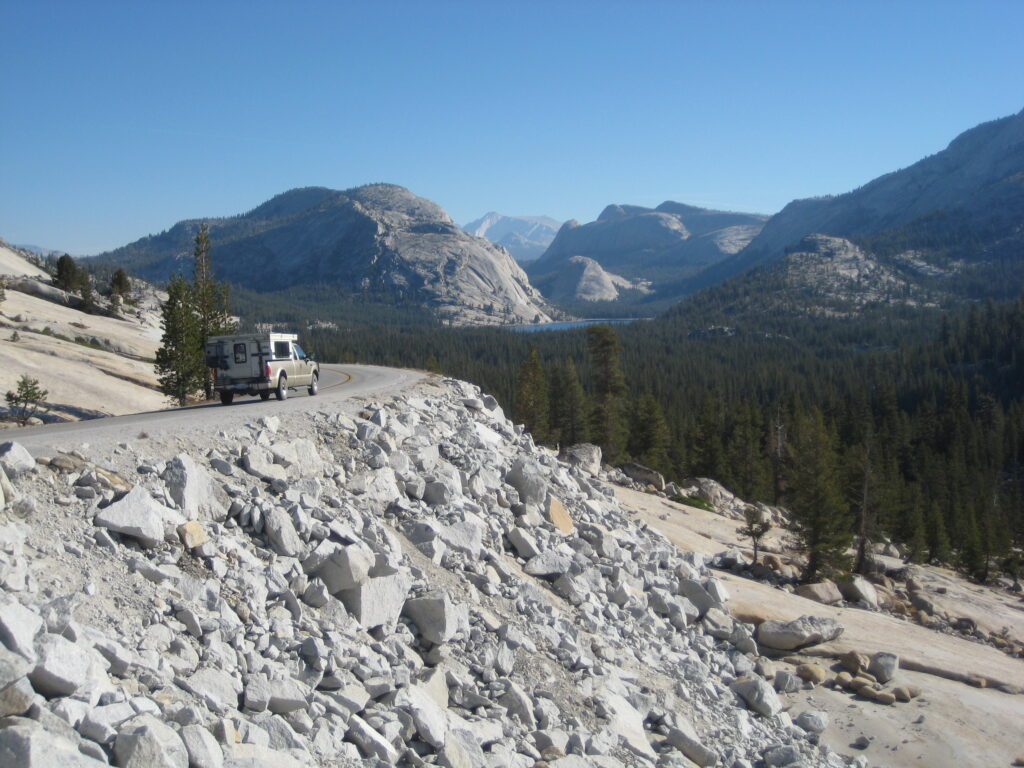 Kommer man fra Lee Vining i vest, venter der en fantastisk køretur ad vej 120, Tioga Road. Kort efter indgangen til nationalparken, kommer man til at køre i 3.031 meters højde hen over Tioga Pass. Bemærk at denne vej kun er åben nogle få måneder hver sommer. Normalt fra 1/6 til 1/10 – men alt afhænger af mængden af sne. Under istiden var hele området en stor gletsjer. Det er flere steder meget tydeligt hvordan enorme mængder af is har skurret hen over klipperne og skabt det usædvanlige landskab. Der er mange smukke steder at stoppe undervejs. Bemærk de er små skilte i vejsiden med et bogstav og et tal, det gør det nemt at vide, hvor det er værd at stoppe undervejs. Jeg anbefaler som minimum: Tenaya Lake (T25) er en smuk sø opkaldt efter en indianerhøvding. Olmsted Point (T24) er et af de smukkeste steder på Tioga Road, her er der en flot udsigt mod klippeformationen Half Dome. Mt. Hoffman (T11) Toppen af det 3.307 meter høje bjerg stak kun lige op af isen under istiden.